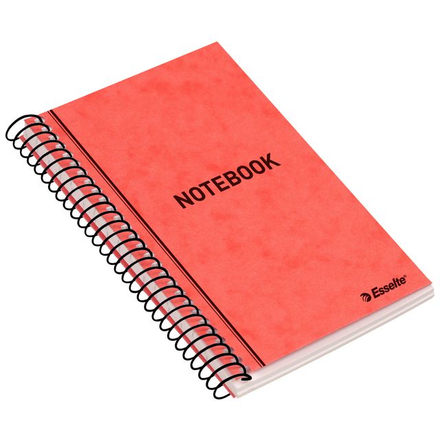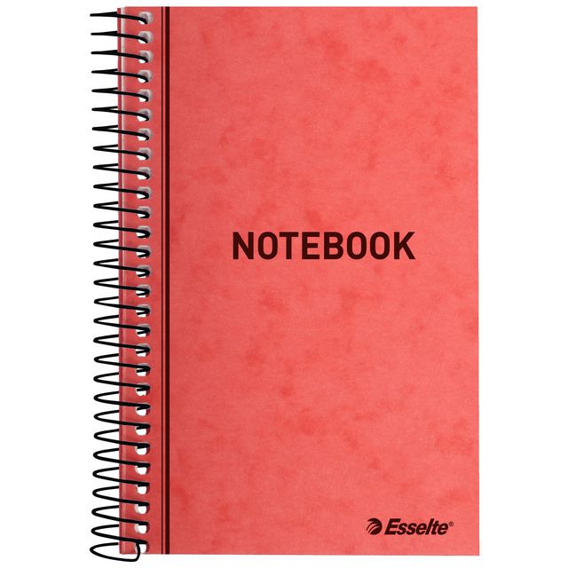 Stilfuld spiralnotesbog med rødt omslag med 'Notebook' skrevet i sort henover omslaget. Det lille format gør det nemmere at bære denne notesbog rundt. Perfekt til kortere noter. Sort plastspiral i venstre kant. 6,0 mm lineal i grå farve. - Antal ark: 50 ark - Papirvægt: 55 g/m² - Sort plastspiral i venstre kant - Ingen perforering - Dimensioner: 140x90mm - Foret - Farve: Rød - Svanemærke Licensnummer: 40410675